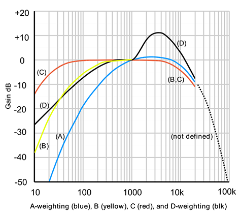 Weighting Curves (spectral filters) A variety of weighting curves have been devised (A, B, C, and D) to assist electronic/digital recording, measuring, and broadcast equipment (with assumed flat, or near flat response) in simulating the ear's frequency-dependent response to intensity. These curves are mainly used in noise measurement, loudness calculations, and hearing evaluations and NOT in sound mixing and mastering. Each type of curve captures best the ear's response at a different input-level range.
