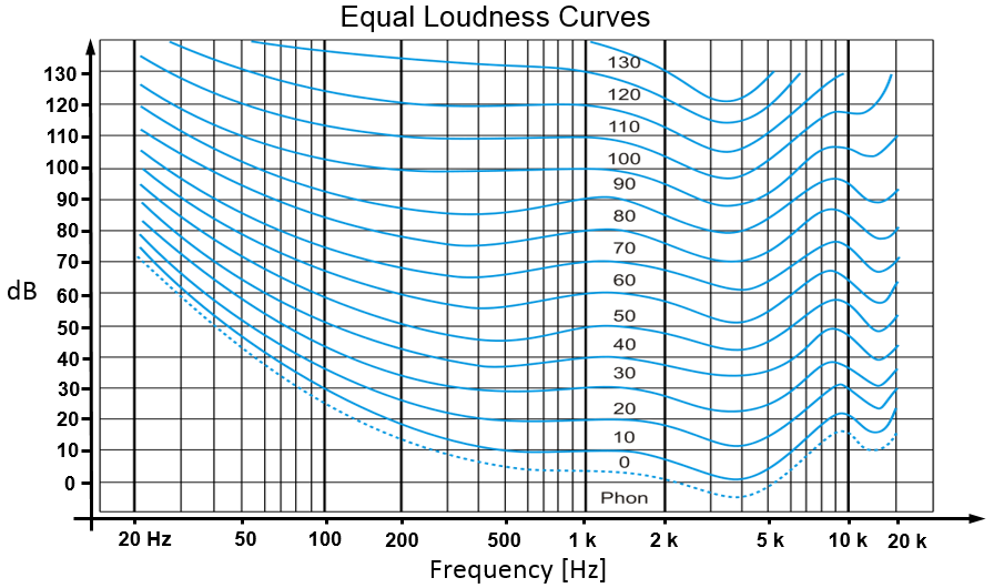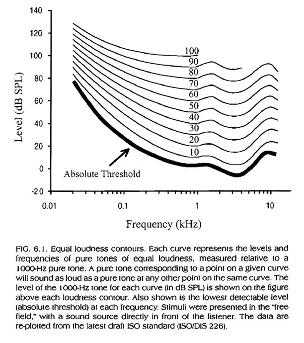 ![]() Equal loudness contours/curves for pure tones (after Fletcher and Munson, 1933)