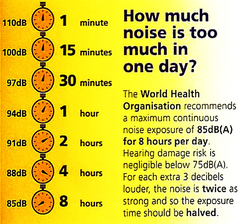 For every doubling of listening time the safe level drops by 3dB (can you guess why? see the image to the right).