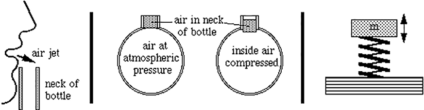_ This rarifies the air inside the body, which then sucks the 'lump' of air back in, and so on.A jet of air from your lips, for example, is capable of deflecting alternately into the bottle and outside, providing the power that keeps the oscillation going.